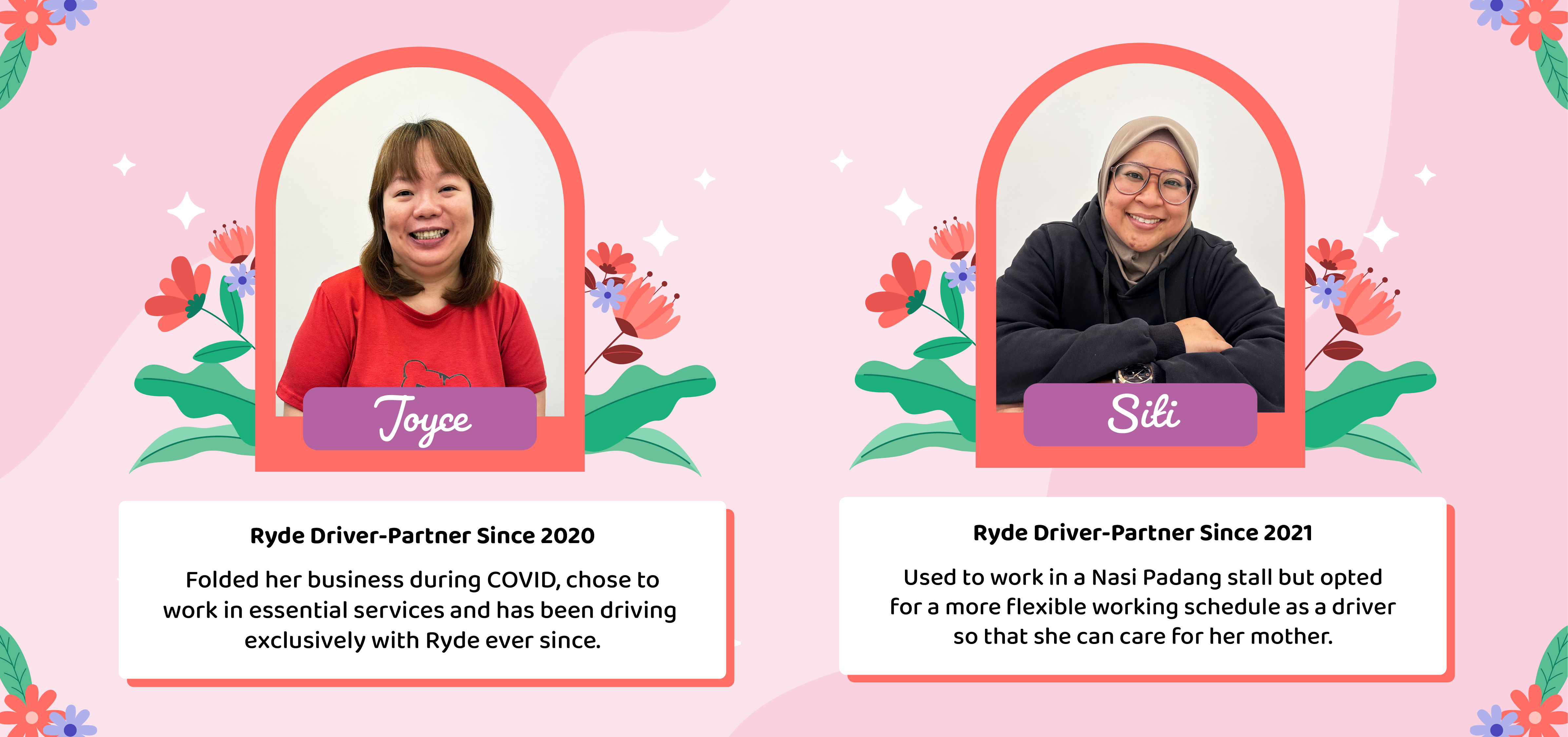 Joyce, a former business owner, faced significant challenges during the COVID-19 Circuit Breaker period when her business was deemed “non-essential’. Eventually, she made the decision to close down her business and looked towards ways of becoming part of the “essential services” industry. Among many options, she ultimately found herself becoming a driver with Ryde.Siti always had a passion for driving. Before she found herself in the ride-hailing industry, she used to help her aunt run a nasi padang stall in Temasek Polytechnic. A few years ago, Siti’s mother suffered a stroke which prompted her to look for alternative ways to earn an income while having a flexible work schedule. She needed a job that allowed her to work “OTOT” (own time, own target), and thus she became a private-hire driver so that she could be her mother’s primary care-giver.