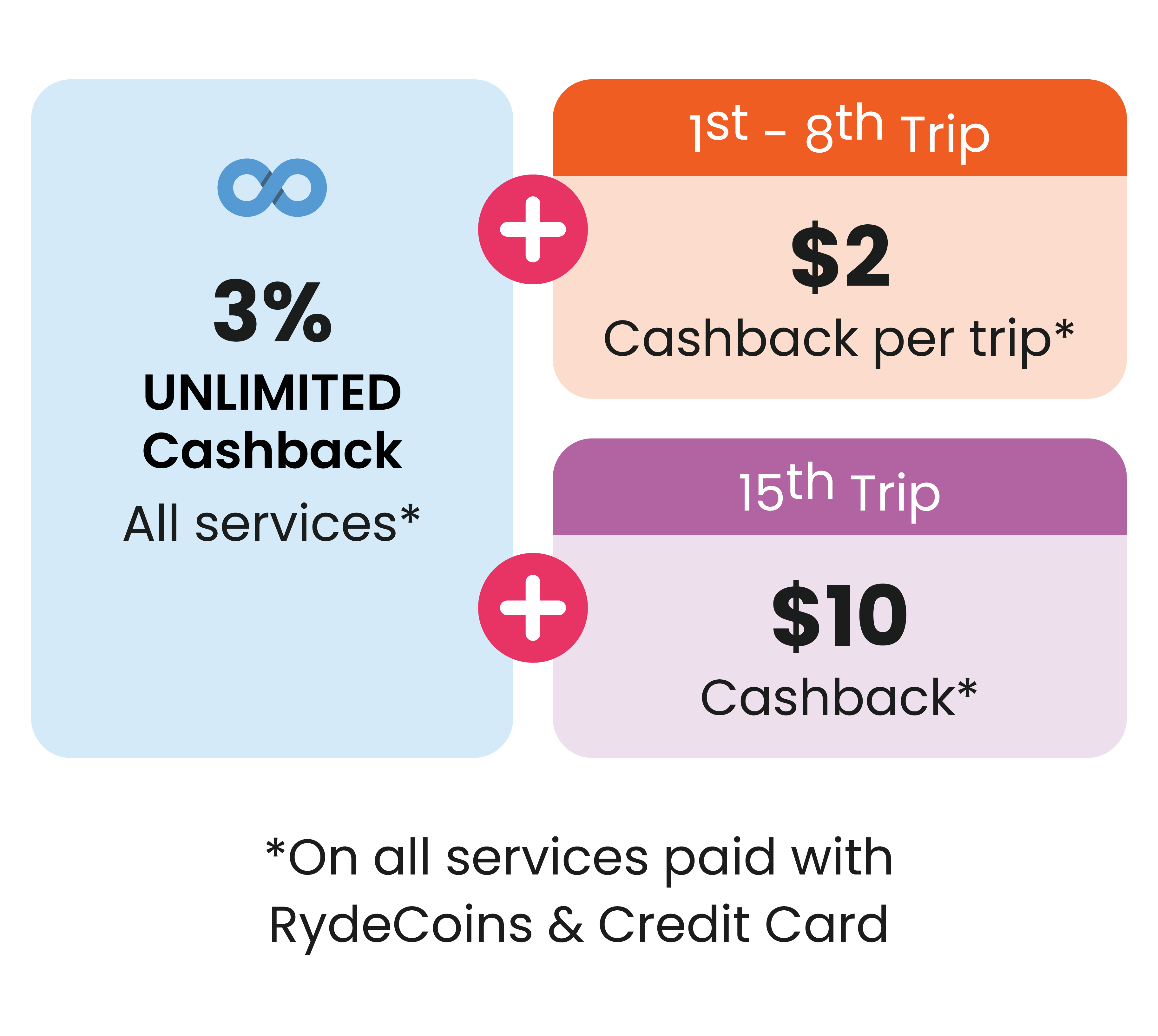 *ALL trip types are eligible with the payment of credit/debit card or RydeCoins. Cashback will be automatically credited as RydeCoins in your wallet.